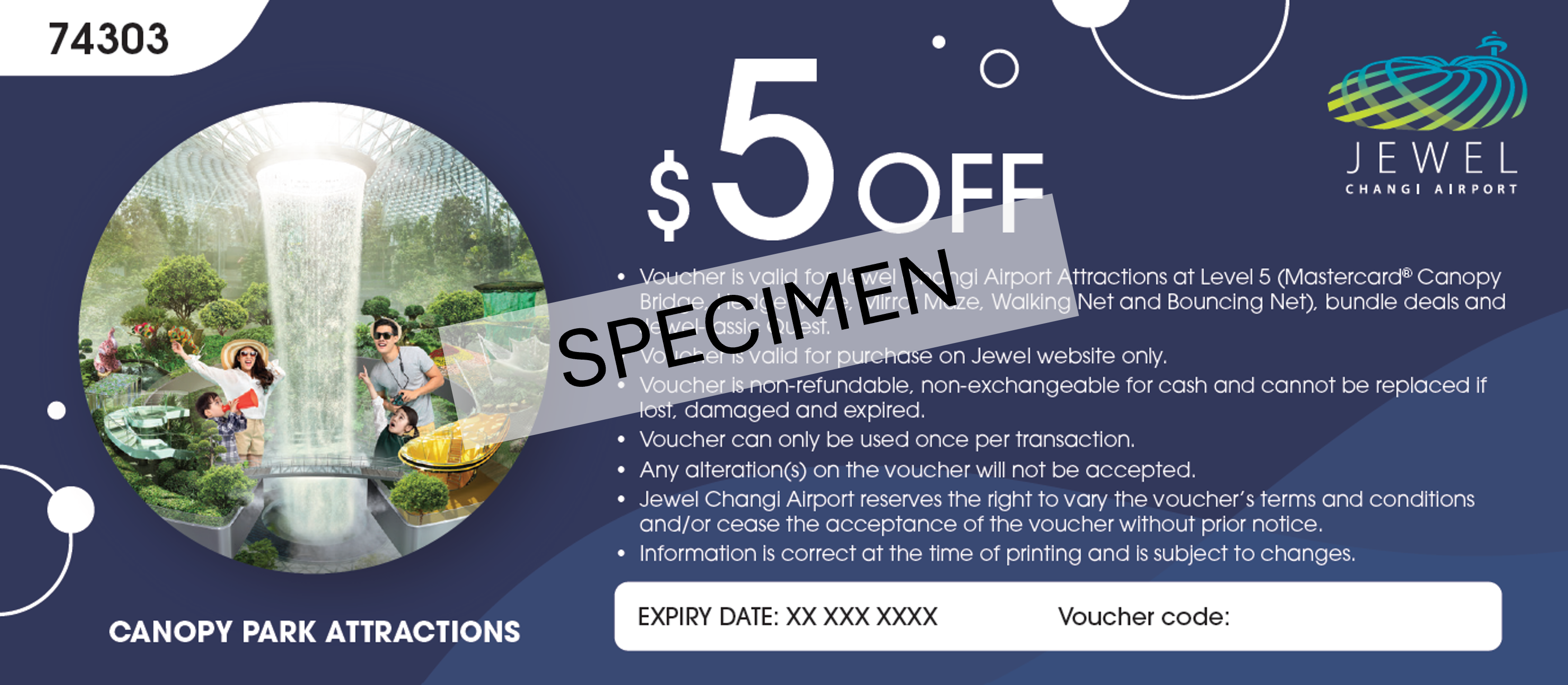 Voucher is valid for Jewel Changi Airport Attractions at Level 5 (Mastercard® Canopy Bridge, Hedge Maze, Mirror Maze, Walking Net and Bouncing Net), bundle deals and Jewel-rassic Quest.