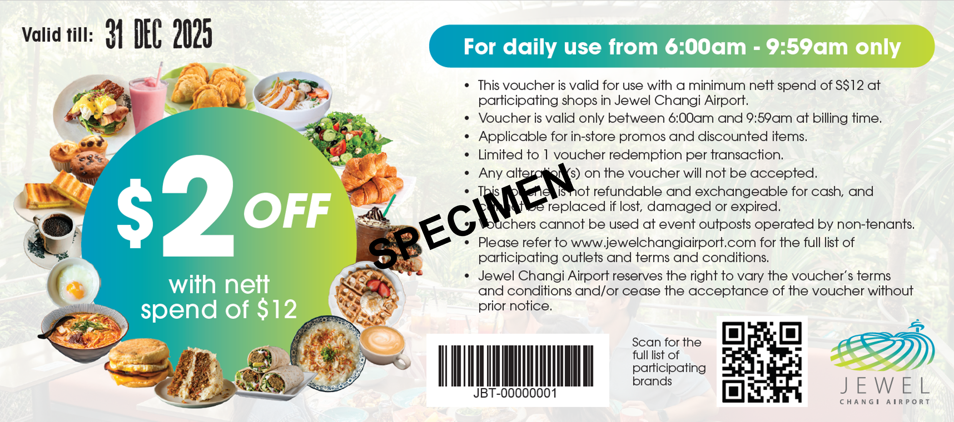 This breakfast voucher is valid for use with a minimum nett spend of S$12 at participating shops in Jewel Changi Airport, from 6am – 9.59am only (shown in receipt).