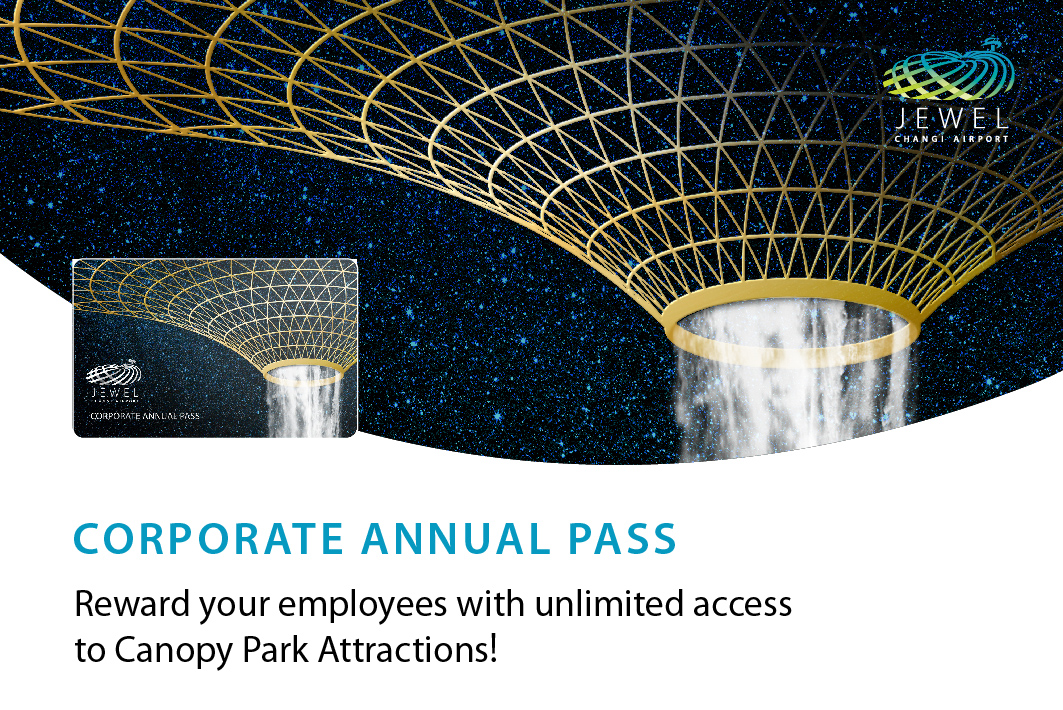 Admission to the various Jewel Changi Airport attractions using the Corporate Annual Pass is subject to blackout dates; closure of attractions due to maintenance or force majeure events; and separate ticketed events. Please refer to the Jewel Changi Airport Attractions website for more information.