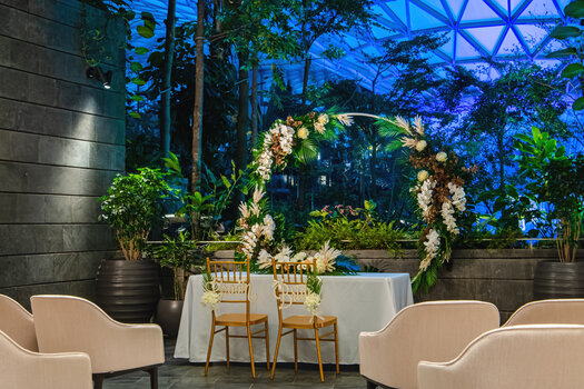 Exchange your vows against the backdrop of the world's tallest indoor waterfall - Jewel Rain Vortex and the lush greenery of the Forest Valley, or capture unforgettable memories in the cool comfort of a beautiful garden complete with a floral arch for your picture-perfect wedding at Jewel.
